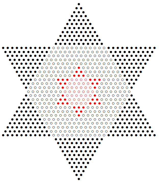Dieser Stern (n=3) besteht aus insgesamt 793 Punkten. Abzüglich seiner sechs Zacken zu je 66 verbleibt innen ein Sechseck aus 397 Punkten. In dieses Sechseck hinein habe ich einen kleineren roten Stern (n=2) gezeichnet. Er hat 73 Punkte. Abzüglich seiner sechs Zacken zu je 6 Punkten verbleibt innen gleichfalls ein Sechseck der Größe 37.