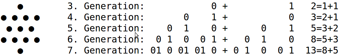 ● 3. Generation: 0 + 1 2=1+1 ● ● ● ● 4. Generation: 0 1 + 0 3=2+1 ● ● ● 5. Generation: 0 1 0 + 0 1 5=3+2 ● ● ● ● 6. Generation: 0 1 0 0 1 + 0 1 0 8=5+3 ● 7. Generation: 01 0 01 01 0 + 0 1 0 0 1 13=8+5Sternzahl, Kaninchenvermehrung [4] und Bitketten (png)