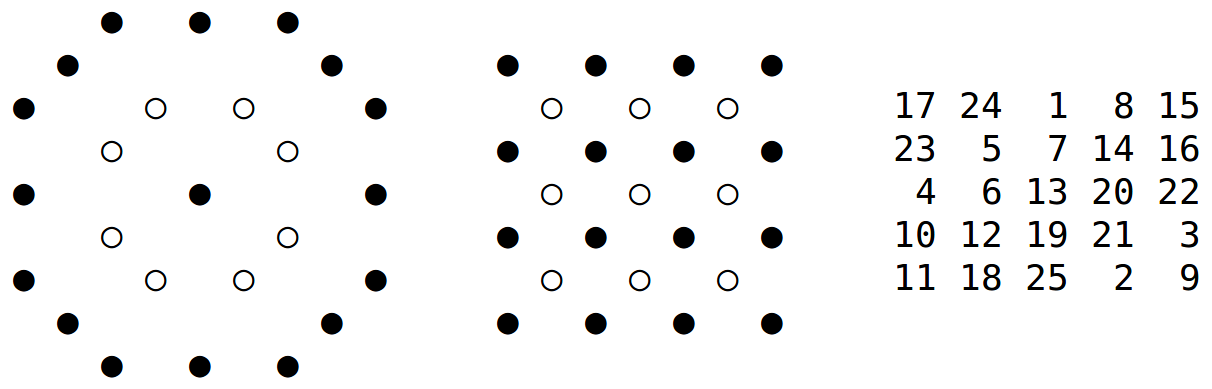 25 als zentrierte Achteck- und Quadratzahl, magisches Quadrat (png)Nach siebenmal sieben Jahren war bei den Juden jedes 50. Jahr ein Erlaßjahr, später dann im Christentum ein heiliges Jahr, das nunmehr vom Papst alle 25 Jahre durch das Einschlagen einer Tür eingeläutet wird. Diese Bevorzugung der 25 ist schlichte Folge der Vierteilung des Jahrhunderts. Deshalb wird die Silberhochzeit nach 25 und nicht nach 20 oder 30 Jahren gefeiert. Und wir neigen zu merkwürdigen Gedenktagen nach 75, 125 oder 375 Jahren. Das wird dadurch befördert, daß Vielfache von 25 sämtlich auf 25, 50, 75 oder 00 enden, die 25 sich also gut vererbt, was natürlich direkte Folge der Vierteilung ist.