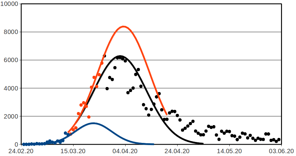 [7] Die schwarze Linie ist keine Prognose, sondern eine den realen Werten (blaue, rote und schwarze Punkte bis zum 19. April) angepaßte Normalverteilung. Sie sieht nicht optimal aus, doch ist zu bedenken, daß diese Kurve nicht nur Ende April, sondern auch im Februar und Anfang März einigermaßen treffen muß. Außerdem ist schon seit einigen Tagen die Zeit des Rattenschwanzes gekommen, der den Verlauf unsymmetrisch macht, womit eine Normalverteilung als globale Ausgleichskurve nicht mehr gut ist.