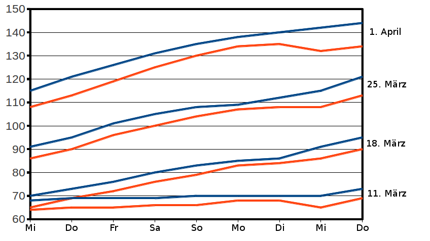 Ein Tag ist kaum vergangen, und ich habe heute, am zweiten Sonntag Judika vor Ostern prompt einen Internet-Abklatsch der Zeit gelesen, in dem die Zahlen des RKI tatsächlich leicht nach oben korrigiert werden, weil man aktuelle Zahlen habe. Möglicherweise nahm man an, die zu geringen Zahlen des RKI seien nur veraltet oder unvollständig. Es ist aber auch egal: Zur Zeit entwickelt sich die Zahl der positiv Getesteten recht gleichmäßig mit einem leicht steigenden R-Faktor von 1,15 bis 1,18. Wenn ich einmal menschenfreundlich annehme, er verharre dort noch zwei Wochen, dann werden es zu Ostern 25.000 täglich sein.