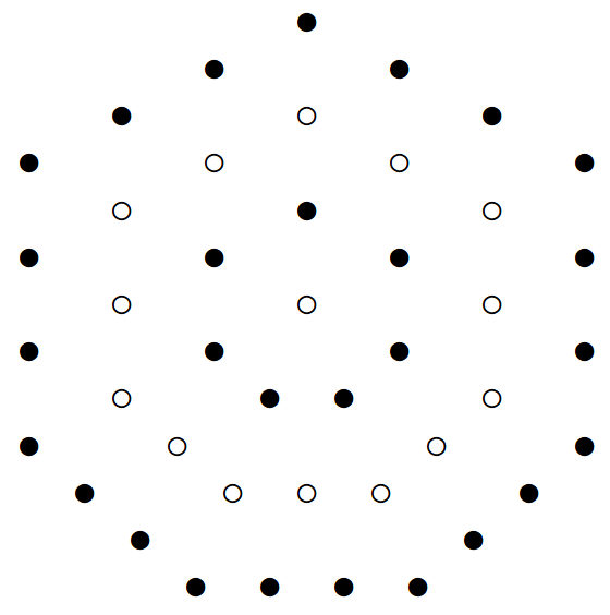 1 1 1 1 1 2 2 2 2 2 1 3 3 1 3 3 3 2 4 2 4 4 4 4 1 3 3 1 3 3 3 2 2 2 2 2 1 1 1 1 1Die linke schaut senkrecht von einer Ecke , die rechte von einer Kantemitte Richtung Mittelpunkt. Die Zahlen geben an, wieviele Kugeln an der bezeichneten Stelle übereinander liegen. Links sind es 12·1+8·2+4·3+4=44, rechts 1·1+2·2+3·3+4·4+3·3+2·2+1·1=44.
