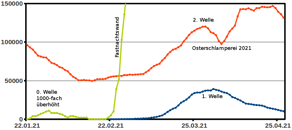 Die rote Linie zeigt zum mittleren Tag einer Woche [1] die Infizierten, meinetwegen auch erfaßten positiv Getesteten der Monate Februar bis April 2021, die blaue Linie das gleiche 365 Tage zuvor. [2] Ebenso die grüne, doch in 1000-facher Überhöhung der der Zahlen. [3] Deutlich ist unser Mehrfach-Versagen zu sehen. Mit der Fastnacht 2020 hätte alles vorüber sein können, wenn man die wenigen Infizierten rigoros abgesondert und inquisitorisch nach Kontakten befragt sowie keinen mehr ohne Zwangsquarantäne ins Land gelassen hätte. Das gleiche wäre auch zu Beginn der ersten Welle noch möglich gewesen. Glücklicherweise stellte sich trotz weiterer Versäumnissse dank Angst, Schrecken und Beschränkungen ein zu erwartender Verlauf gemäß einer Normalverteilung ein. Zu Muttertag hätte Corona in Deutschland vergessen sein können.
