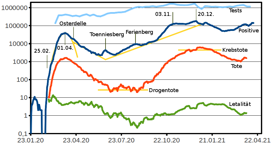 Wenn ich einmal von 83,5 Millionen Deutschen oder in Deutschland lebenden Menschen, meinetwegen auch zuzüglich der sich hier illegal aufhaltenden oder abzüglich der im Ausland befindlichen, so wurde gestern eine Mortalität von einem Promille (1 von 1000) überschritten. Bereits am 28. April war eine Inzidenz von vier Prozent (1 von 25) erreicht. Die sich daraus ergebende Letalität von 2,5 Prozent (1 von 40) noch ein paar Tage früher am 23. April. Letztere war im November bereits auf 1,5 Prozent gesunken. Wir haben es aber geschafft, wieder Alte ins Spiel zu bringen. Viele Länder sind in dieser Beziehung deutlich besser, auch wenn ich die mit unredlichen Zahlen oder sehr junger Bevölkerung außen vor lasse. Offensichtlich wurde in Deutschland die Letalität nicht runtergetestet. Es blieb die ganze Zeit bei einer Million Tests pro Woche. Woher andere die hohen Testkapazitäten genommen haben, ist mir schleierhaft. Vielleicht haben sie erhöhte Temperatur mitgezählt. Es ist auch egal, denn bei einem Schwanzvergleich zählt für mich in erster Linie die Mortalität. Und da müssen wir noch zulegen, um mit Tschechien, Belgien, England, Italien, den USA, Brasilien, Spanien, Mexiko, Polen, Frankreich und Schweden konkurrieren zu können. Ja, die Schweden hinten in meiner Aufzählung, weil sie dazugelernt haben und dank der in vielen Ländern überschwappenden zweiten Welle nun ihre desaströse Leistung zu Beginn vergessen machen können.