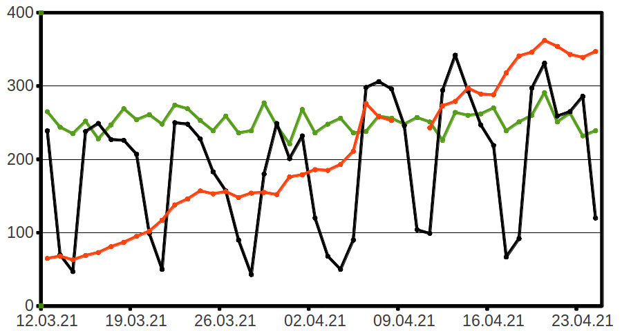 Das Ergebnis zeigt die rote Kurve und verschweigt dabei noch das den oberen Rahmen sprengende Maximum Ende 2020. Wie wenig ernst wir alles nehmen, zeigt auch der Einbruch um die Osterzeit 2021, in der man es noch nicht einmal für nötig hielt, zu testen oder wenigsten Tote zeitnah zu melden. Blamabel, wenn man es mit der kaum zu erkennenden und umgekehrt nach oben weisenden Osterdelle in der blauen Kurve vergleicht. Nicht ansatzweise ist in der roten Kurve ein Bemühen der Menschen zu erkennen. Der zunächst schwächer werdende Anstieg, der zum gerade eben überwundenen Höhepunkt führte, ist wohl den Impfungen zu verdanken, möglicherweise auch der Bundesbremse.
