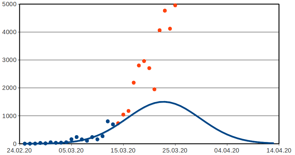 [5] Noch gestern waren die Zahlen der Wikipedia irgendwie zusammenkopiert. Weshalb einmal die Zahl der Neuerkrankten nicht der Differenz der Gesamtzahlen entsprach. Heute ist nun ein Tag entfallen, die Null-Uhr-Daten werden nicht mehr dem neuen, sondern dem vergangenen Tag zugeordnet. Der Verlauf wird dadurch ebenmäßiger und eine Prognose am heutigen 22. März entspricht eher dem Augenschein. Die Breite bleibt unverändert, das Maximum mit 2800 liegt mit dem 19. März früher und ist bereits überschritten. Insgesamt sind 50.000 zu erwarten.