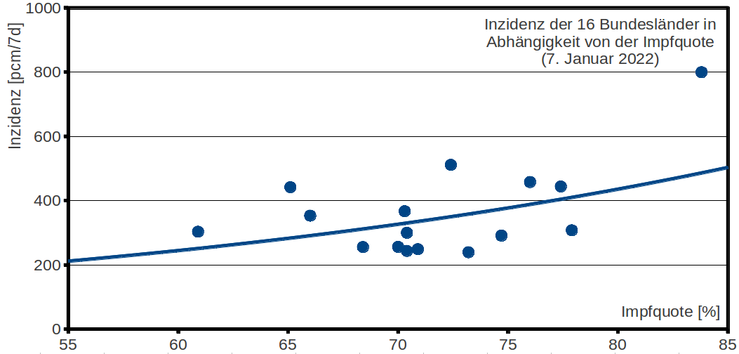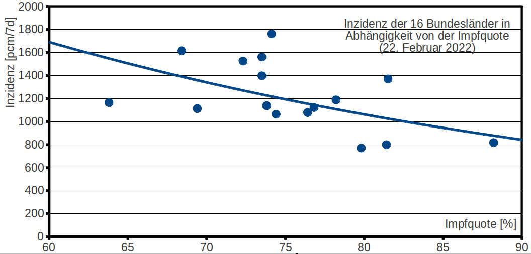 Ein Beispiel für einen fehlenden oder zufälligen Zusammenhang: Wo viel geimpft wurde, sind die Inzidenzen hoch. Das stimmte. Einen Grund kannte ich nicht, obwohl auch nichts dagegen spricht, daß man bei fallenden Inzidenzen nachlässig wird. Insbesondere im Osten, wo man sich riesige Fallzahlen gönnte, fielen sie aus Angst, schlechter Erfahrung, Gesichtswahrung oder was auch immer in den Keller, worüber die Impfungen vernachlässigt wurden.