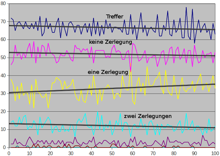 r = ln2 = 69% Trefferdichte p(0) = e−r = 1/2 = 50% haben keine Zerlegung p(1) = r⋅p(0) = 35% haben eine Zerlegung p(2) = r⋅p(1)/2 = 12% haben zwei Zerlegungen p(3) = r⋅p(2)/3 = 3% haben drei ZerlegungenDas sind die Ergebnisse einer Überschlagsrechnung, die unberücksichtigt läßt, daß die Treffer nicht wirklich unabhängig fallen. Es ist deshalb nicht selbstverständlich, daß schon bei kleinen Zahlen die errechneten Werte einigermaßen getroffen werden: