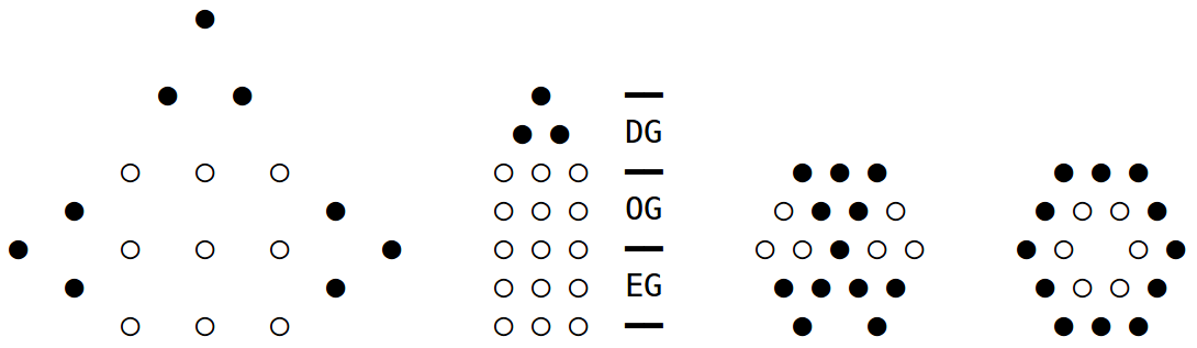 Es bleiben die Volljährigkeit mit 18 Jahren und ein paar weniger interessante Figuren mit 18 Punkten. Ein Dreicksprisma mit drei Punkten entlang jeder Kante umfaßt 3·D₃=3·6=18 Punkte. Eine dreischichtige Pyramide aus Fünfeckzahlen gemäß 1+5+12=18 mag ich mir lieber nicht vorstellen. Bleibt nur noch die dritte Siebeneckzahl 1+6+11=18. Aber wie stelle ich Siebeneckzahlen vernünftig dar, denn sie liegen blöd zwischen den Sechseckzahlen (Dreieck mit drei Zacken) und den Achteckzahlen (Quadrat mit vier Zacken). Es bleibt eigentlich nur ein Quadrat mit drei Zacken oder ein zweistöckiges Haus mit Dach. Grundsätzlich auch ein großes Dreieck mit vier kleinen, woraus sich ein Sechseck aus 19 Punkten mit einem Loch ergibt.