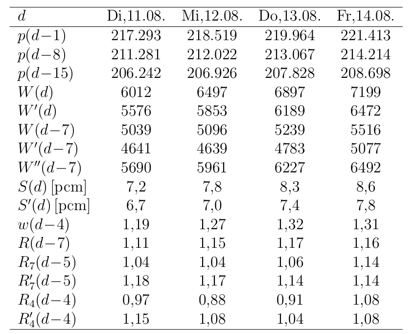 [1] Gerne hätte ich statt der Werte zum Tag d−7=07.08. die aktuellen zum heutigen d=14.08. betrachtet, müßte dann aber noch eine Woche warten, bis W″(d) einigermaßen stabil vorliegt.