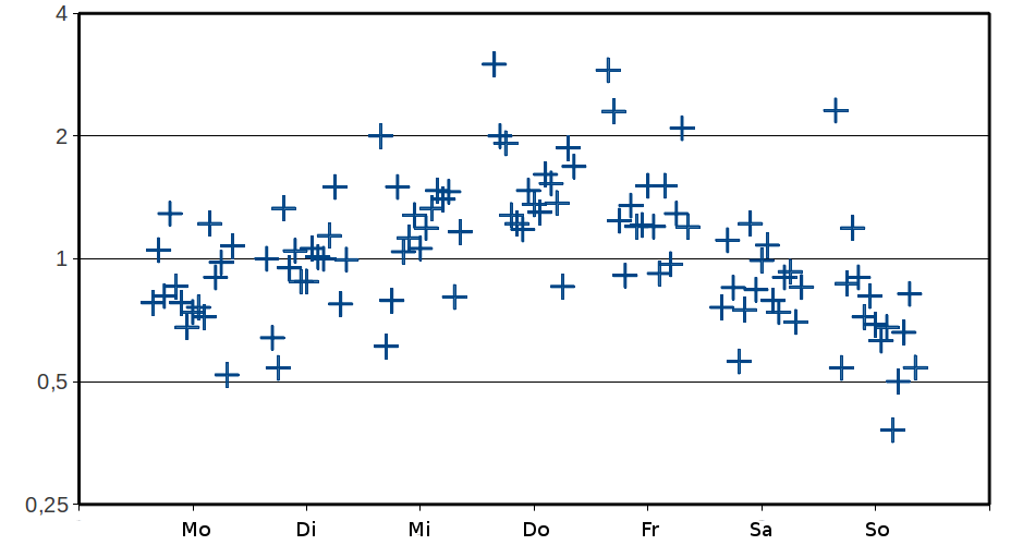 [1] Dieser Wert ist etwas extremer als das Verhältnis zum Wochendurchschnitt und etwas größer, weil er sich auf das gegenüber dem arithmetischen etwas kleinere geometrische Mittel bezieht. Dafür habe ich mich entschieden, weil es einer ‚exponentiellen‘ Entwicklung besser entspricht, ohne viel Aufwand zu treiben. In jedem Falle aber zeigt die Abbildung den grundsätzlichen Verlauf, der mit großer Regelmäßigkeit Woche für Woche eintritt.