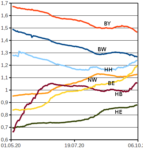 [1] Zwei Monate später stagniert Nordrhein-Westfalen, ist aber dennoch auf Platz 4 vorgerückt, denn das Saarland kam entgegen. Das liegt jetzt auf dem sechsten Platz, weil es auch Berlin vorbeiziehen ließ. Bald ist auch Bremen dran. Auch die Bayern nutzen die nordrhein-westfälische Stagnation. Nachdem sie in Kopfzahlen um anderthalb tausend zurückgefallen waren, konnten sie wieder aufholen und lagen am 17. September für einen Tag wieder vorne. Ob Laschet seine Kommunalwahlen und die bayrischen Testpannen in einen dauerhaften Vorsprung gegenüber Söder ummünzen kann, wird sich zeigen.