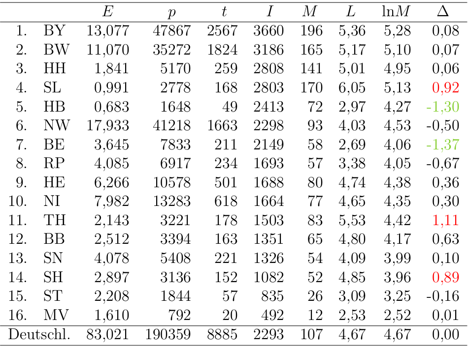 [5] An anderer Stelle gehe ich von ln(M+e) aus, damit für kleine M keine unplausiblen Werte unterhalb von 1 oder gar im negativen Bereich erreicht werden. Selbst für Mecklenburg-Vorpommern bleibt der Unterschied unter 0,2.