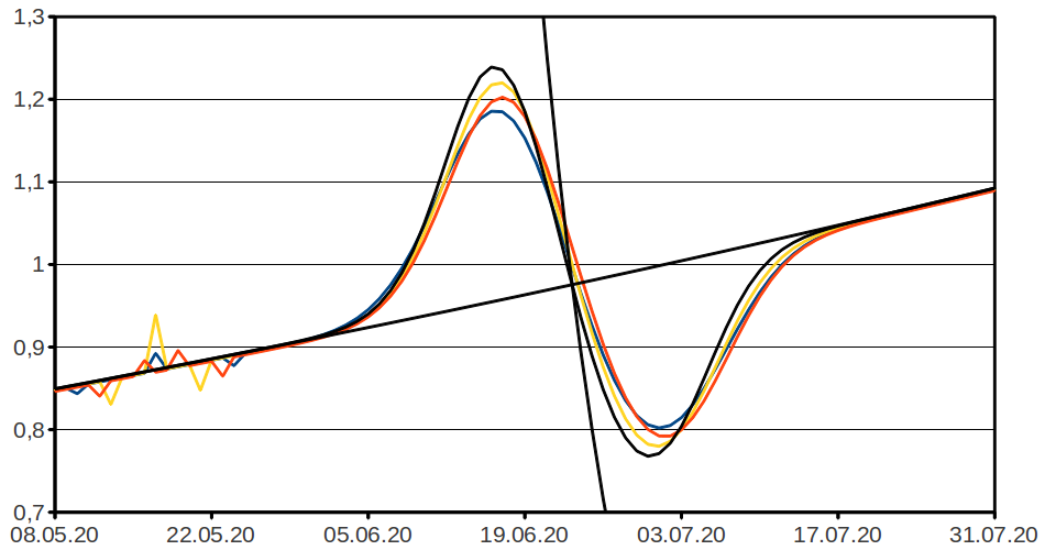 Ich sehe meine blauen Werte als Sieger, auch wenn zum Ausgleich der kleinen Spitze sieben Tage zuvor und danach je eine in die andere Richtung auftritt. [6] Bei den gelben Viertageswerten ist es ähnlich. Nur ist der Ausschlag deutlich stärker und wird schon im Abstand von vier Tagen ausgeglichen. Die roten Siebentageswerte sind im Volumen nicht schlechter als meine. Es entsteht aber ein Zentralkrater, weil in der Mitte die Störstelle sowohl im Zähler als auch im Nenner addiert wird. Deshalb gefallen mir meine Werte etwas besser, die Viertageswerte fallen durch.