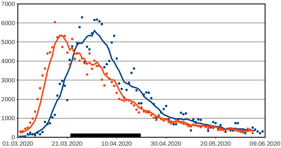 Noch trauriger als diese unnötige Verwirrung ist der waagerechte Verlauf der blauen, roten und gelben Linie ab Mitte April, während die auf den Zahlen bis zum 19. April basierende Erwartung gemäß der angepaßten Normalverteilung weiterhin exponentiell fällt. Mit Disziplin hätten wir entlang dieser schwarzen Linie bis zum Muttertag die Epidemie so gut wie überwunden. Ungeduld, Disziplinlosigkeit, Öffnungsdiskussionsorgien und Drängeleien einiger Sparten [2,3] fordern nun nicht nur unnötig Tote, sie richten auch fortgesetzten wirtschaftlichen Schaden an.