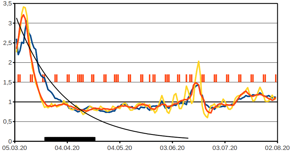 Das Bild zeigt drei schwarze Verläufe. Eine stark mit einer Halbwertszeit von 6,2 Tagen fallende exponentielle Linie, die den R-Faktor zu Tönnies und Umgebung nähern soll. [2] Eine weitere mit einer Verdoppelungszeit von 217 Tagen kaum sichtbar exponentiell steigende schwarze Linie steht für den Rest Deutschlands. Aus beiden ergibt sich die wellenförmige Linie als Gesamtwert. [3] Es liegt also in der Natur der Sache, daß bei einem lokalen Ausbruch größeren Ausmaßes die R-Werte zunächst ansteigen, danach unter die Normallinie fallen, um sich ihr letztlich wieder zu nähern.