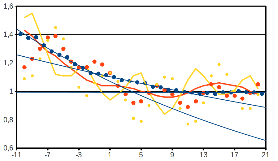 [1] Um redlich zu sagen, ob ein Wochentag bevorzugt wird, reicht es insbesondere dann nicht, allein mit dem Vortag zu vergleichen, wenn der allgemeine Trend stark schwankt. Vernünftig ist ein Vergleich mit dem geometrischen Mittel der umrahmenden Kalenderwoche. Dazu muß ich für die heutigen Zahlen noch drei Tage warten.