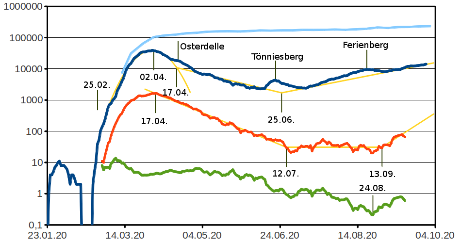 31.08.-heute – Zweite Welle (Herbst) Die Zahl der Erkrankungen steigt weiterhin langsam an. Daran haben sich viele gewöhnt. [6] Zumindest Politikern ist aber aufgefallen, daß seit dem 13. September die Todesfälle wieder anziehen, von 4 auf derzeit 10 pro Tag. Damit sterben seit dem 30. August die neu Erkrankten wieder leichter. Ihre Sterblichkeit ist von nur einem viertel Prozent bis heute über ein halbes gestiegen. Die Hedonisten stecken ihre Vorfahren wieder an, bevorzugt auf Hochzeitsfeiern. Die kommenden Wochen werden zeigen, ob dieser Trend anhält und sich zu einer für jederman erkennbaren zweiten Welle entwickelt.